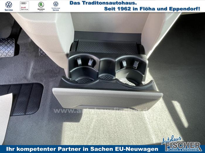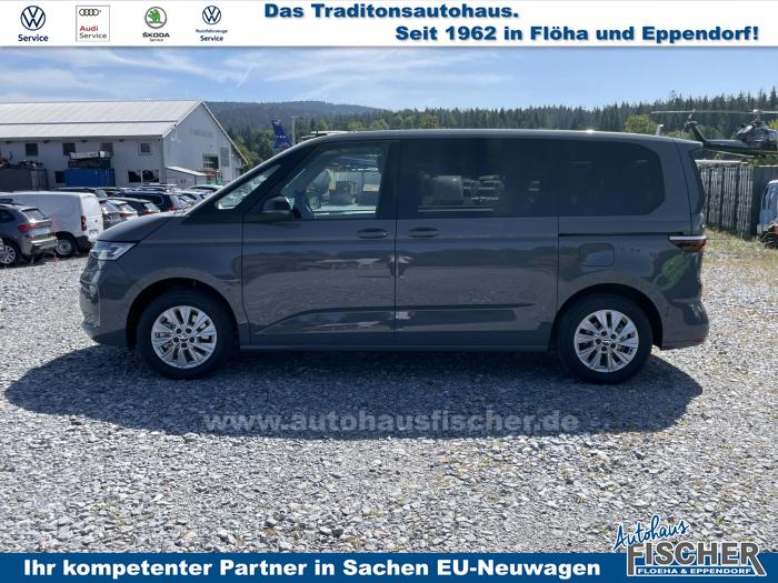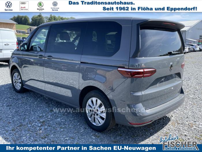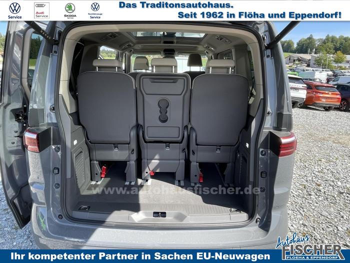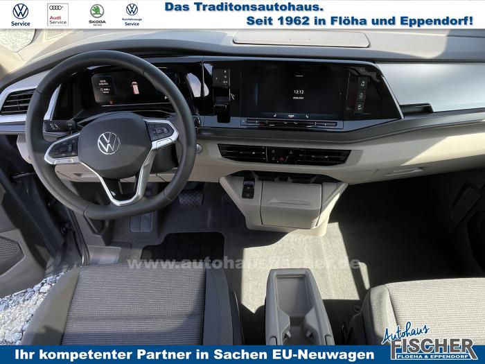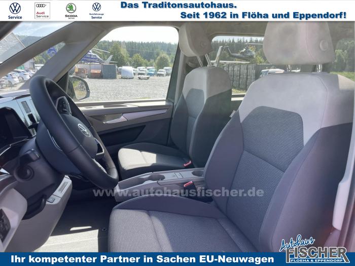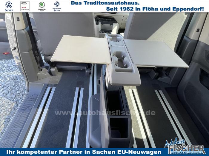 2 USB-C-Schnittstellen vorn, 8 Lautsprecher, App-Connect inklusive App-Connect Wireless für Apple CarPlay und Android Auto, Digitaler Radioempfang, Mobiltelefon-Schnittstelle, Radio Ready 2 Discover mit 25,4 cm (10) Touch-Farbdisplay inklusive Streaming & Internet, Vorbereitet für VW Connect und VW Connect Plus, Dynamische Fernlichtregulierung Dynamic Light Assist für LED-Matrix-Scheinwerfer, IQ.LIGHT-LED-Matrix-Scheinwerfer mit LED-Tagfahrlicht, LED-Rückleuchten, abgedunkelt, Leuchtweitenregulierung, dynamisch, mit dynamischem Kurvenfahrlicht, Umfeldbeleuchtung im Türbereich, Fenster in der Schiebetür, links, Fenster in der Schiebetür, rechts, Frontscheibe in Verbundsicherheitsglas, wärme- und geräuschdämmend, Panoramaglasdach, abgedunkelt, zweiteilig, Scheiben im Fond abgedunkelt, Bodenbelag im Fahrgastraum mit trittverstärktem Velours-Teppichboden, Dekor-Einlagen Scale Light Grey, Handschuhfach ohne Beleuchtung, Multifunktions-Lederlenkrad mit Schaltwippen, Multifunktionstisch/Mittelkonsole mit 3 Becherhaltern, im ganzen Fahrzeug verschiebbar, Nichtraucherausführung, Sicherheitsinnenspiegel, automatisch abblendend, 3-Zonen Klimaanlage Air Care Climatronic mit zusätzlichem Bedienteil im Fahrgastraum (nicht beim Beach), Kraftstoffbetriebene Zusatzheizung, Parkpaket Basic, Top Paket, 17 Leichtmetallräder Dundrod, in Silber, Bordwerkzeug und Wagenheber (in den Staufächern im Gepäckraum), Leichtmetall-Reserverad mit Fahrbereifung, Airbags für Fahrer und Beifahrer, mit Beifahrer-Airbag-Deaktivierung, Diebstahl-Alarmanlage mit Innenraumüberwachung, Back-up-Horn und Abschleppschutz, Elektronisches Stabilisierungsprogramm und elektromechanischer Bremskraftverstärker, Notrufsystem eCall, Voraussetzung: Verfügbarkeit benötigter Mobilfunknetze, Seiten- und Kopfairbag für Fahrer und Beifahrer, Kopfairbags für die äußeren Sitzplätze hinten und Mittenairbag vorn, Servotronic, Vorbereitung Alcohol Interlock, Warnton und -leuchte für nicht angelegte Sicherheitsgurte vorn und hinten, 3 Einzelsitze in Fahrtrichtung in der 2. Sitzreihe, Bi-Color Sitzbezüge in Stoff, Dessin Bright Dots, Ohne Sitze in der 3. Sitzreihe, Sitz links mit Höhenverstellung und 2-Wege-Kopfstütze, in der 1. Sitzreihe, Sitz rechts mit Höhenverstellung und 2-Wege-Kopfstütze, in der 1. Sitzreihe, Sitzheizung für beide Sitze im Fahrerhaus, links und rechts getrennt regelbar, Abgaskonzept, WLTP3 M1, N1-I//EU6EB, Zulassung für maximal 5 Sitzplätze, 2 Fahrzeugschlüssel, Ablenkungs- und Müdigkeitserkennung, Ausweichunterstützung und Abbiegeassistent, Digital Cockpit, Geschwindigkeitsbegrenzer und Intelligent Speed Assist, Geschwindigkeitsregelanlage (GRA) elektronisch, Heckklape elektrisch (öffnend/schließend), Heckklappe mit elektrischer Öffnung und Schließung, Notbremsassistent Front Assist mit Fußgänger- und Radfahrererkennung, Parklenkassistent Park Assist und Einparkhilfe im Front- und Heckbereich, Reifenkontrollanzeige (nach EU Typprüfung), Rückfahrkamera Rear View, Spurhalteassistent Lane Assist, Verkehrszeichenerkennung, Zentralverriegelung mit schlüssellosem Startsystem Keyless Start, ohne Safesicherung, 17 Scheibenbremsen vorn und 16 Scheibenbremsen hinten, Außenspiegelgehäuse in Schwarz hochglanz, Leiste zwischen den Scheinwerfern Schwarz glänzend lackiert, Schiebetüren elektrisch, links und rechts, EU-Fahrzeug mit Tageszulassung