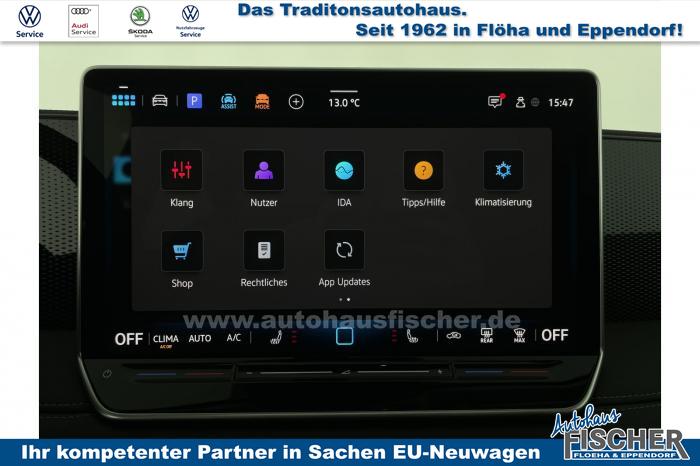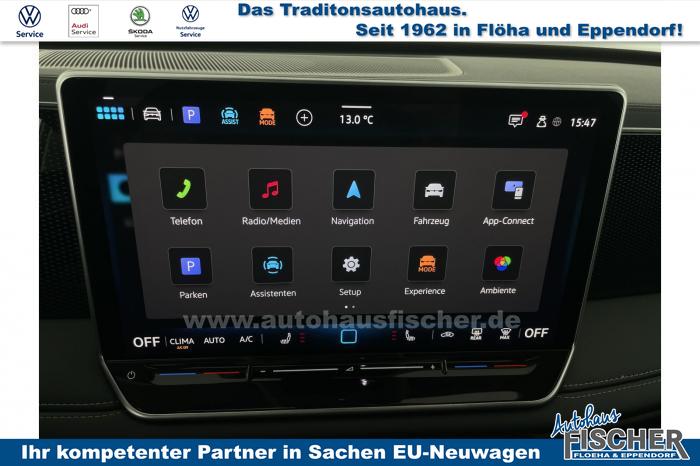 2 USB-C-Ladebuchsen an der Mittelkonsole hinten, 2 USB-C-Schnittstellen vorn, 8 Lautsprecher, App-Connect Wireless für Apple CarPlay und Android Auto, Digitaler Radioempfang DAB , Infotainment-Paket inkl. Navigationssystem Discover, Sprachbedienung, Telefonschnittstelle Comfort mit induktiver Ladefunktion, Touchscreen (32,2 cm/12,9 Zoll), 3D-LED-Rückleuchten, Abbiege- und Schlechtwetterlicht, Ambientebeleuchtung 10-farbig, Fahrlichtschaltung automatisch, mit LED-Tagfahrlicht sowie Begrüßungs- und Verabschiedungslicht, LED-Plus-Scheinwerfer, Leiste zwischen den Scheinwerfern und Rückleuchten sowie Türgriffmulden beleuchtet, Leuchtweitenregulierung dynamisch, Panorama-Ausstell-/Schiebedach mit Panoramadach hinten, Verbundsicherheitsglas geräuschdämmend für Türscheiben, Heck- und Seitenscheiben hinten abgedunkelt, Bedarfsorientierte Batterieladung, Innenspiegel automatisch abblendend, Mittelarmlehne vorn, Multifunktionslenkrad in Leder, beheizbar, mit Schaltwippen, Netztrennwand, Textilfußmatten vorn und hinten, Klimaanlage Air Care Climatronic mit Aktiv-Kombifilter, Bedienelementen hinten und 3-Zonen-Temperaturregelung, Design-Paket, Komfortpaket inkl. Memory-Funktion für Parkassistent, Paket Endless, Paket No Limit, Winterpaket inkl. Lenkrad beheizbar, 18 Leichtmetallräder Bologna in Schwarz, Oberfläche glanzgedreht, Tire Mobility Set: 12-Volt-Kompressor und Reifendichtmittel, Airbag für Fahrer und Beifahrer, mit Beifahrerairbag-Deaktivierung, Diebstahlwarnanlage mit Innenraumüberwachung, Back-up-Horn und Abschleppschutz, Elektronisches Stabilisierungsprogramm und elektromechanischer Bremskraftverstärker, ISOFIX-Halteösen für Kindersitze auf den äußeren Rücksitzen sowie auf dem Beifahrersitz, Kopf- und Seitenairbags vorn und hinten, Center-Airbag vorn, Notruf-Service, keine Registrierung notwendig, Dienst ist bei Auslieferung aktiviert, Wegfahrsperre elektronisch, Beifahrersitzlehne komplett umklappbar, Komfortsitze vorn, Rücksitzbank längs verschiebbar, -lehne asymmetrisch geteilt umklappbar, Neigung einstellbar, Vordersitze beheizbar, Vordersitze mit Höheneinstellung, Anschlussgarantie 3 Jahre / 100.000 km, 12-V-Steckdose im Gepäckraum, 230-V-Steckdose im Gepäckraum, 12-V-Steckdose in der Mittelkonsole vorn, Automatische Distanzregelung ACC, Berganfahrassistent, Digital Cockpit Pro, mehrfarbig, verschiedene Info-Profile wählbar, Elektronische Parkbremse inkl. Auto-Hold-Funktion, Fernlichtassistent Light Assist, Head-up-Display, Heckklappe mit sensorgesteuerter Öffnung und zeitverzögerter elektrischer Schließung, mit Fernentriegelung, Memory-Funktion für Parkassistent, Müdigkeitserkennung, Notbremsassistent Front Assist mit Fußgänger- und Radfahrererkennung, Parkassistent Park Assist inkl. Einparkhilfe, Regensensor, Reifenkontrollanzeige, Rückfahrkamera Rear View, Schlüsselloses Schließ- und Startsystem Keyless Access, Spurhalteassistent Lane Assist, Spurwechselassistent Side Assist, Umstellung Infotainment / Bordcomputer auf DE, Verkehrszeichenerkennung, Start-Stopp-System mit Bremsenergie-Rückgewinnung, Anhängevorrichtung anklappbar, mit elektrischer Entriegelung, inkl. Anhängerrangierassistent Trailer Assist, Außenspiegel elektrisch einstell-, anklapp- und beheizbar, Außenspiegelgehäuse und Türgriffe in Wagenfarbe, Dachreling silber eloxiert, EU-Fahrzeug mit Tageszulassung